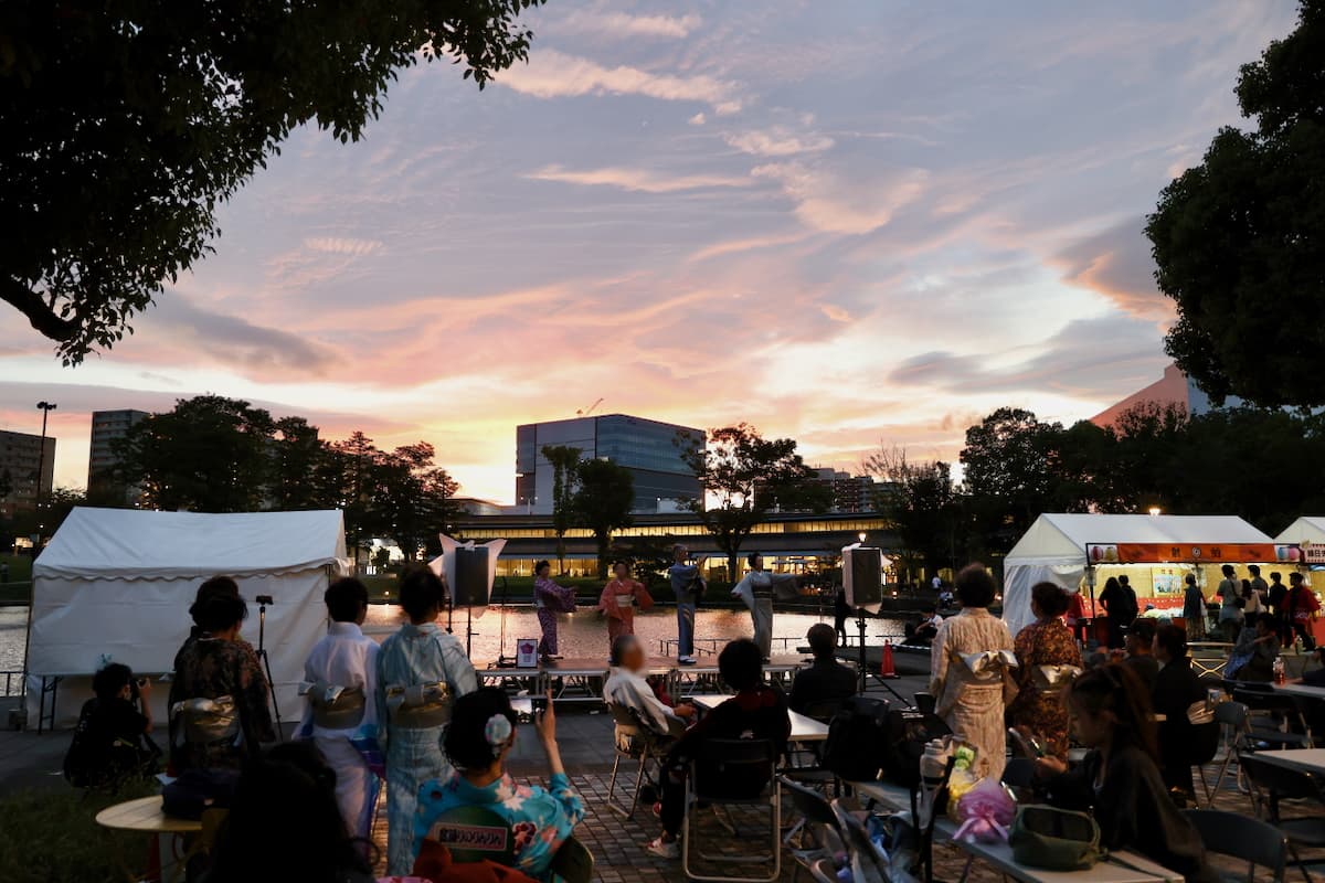 夕方からは「盆踊り」が開催。初日にはきれいな夕景の中、「盆・そわぁる」、「花うえ民踊龍影会」の皆さんが登場して、秋の中央公園を彩りました。